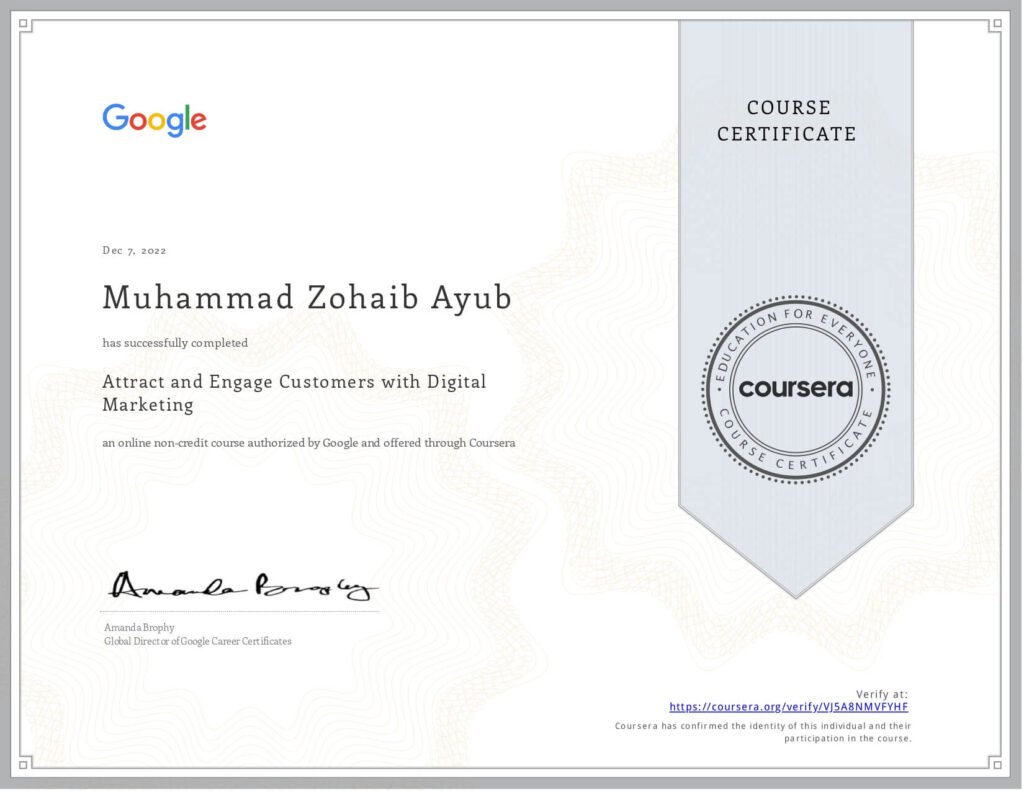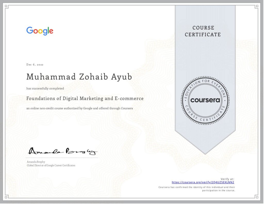 Zohaib Ayub is a Google Certified Digital Marketer and E-commerce Specialist, having completed a series of professional courses that enhanced his expertise in various aspects of digital marketing. These certifications reflect his deep understanding of foundational marketing concepts and practical strategies used in today’s competitive online landscape. Below, you’ll find a detailed list of Zohaib’s certifications, with links to individual pages for each course.