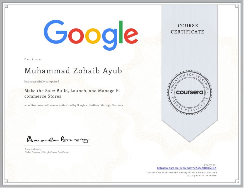 Through this certification, Zohaib learned how to build and launch e-commerce stores, focusing on key aspects such as product management, store design, and customer conversion strategies.