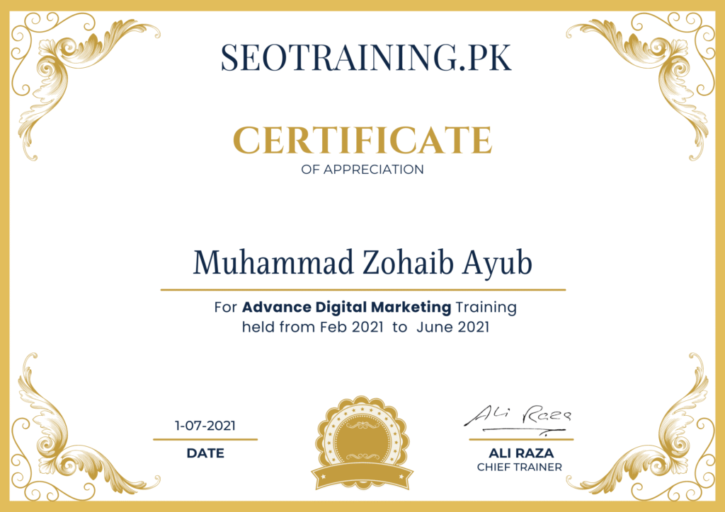 Zohaib Ayub’s comprehensive training in digital marketing and e-commerce has equipped him with valuable skills that help businesses grow and succeed in the competitive digital space. These certifications are a testament to his dedication to mastering the digital marketing field.